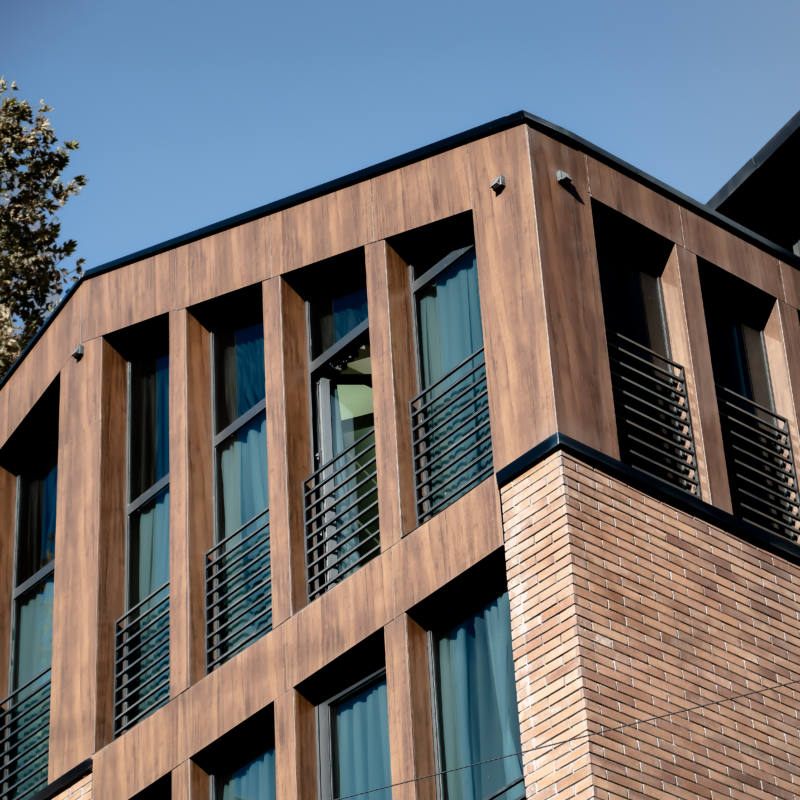 **A 65-room hotel on Ushangi Chkheidze Street combines two volumes: one with decorative historic brickwork, the other clad in travertine, connected by glass, and topped with a copper roof, enriching Tbilisi’s mixed historic streetscape.**