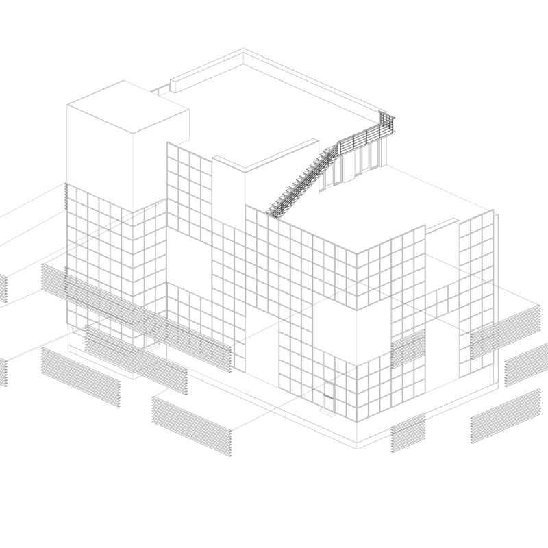 **The GDG office near Vake Park features a clear geometric form and rational floor plan. Its simple façade, with alternating windows, ceramic tiles, and aluminum bands, balances austerity and openness.**