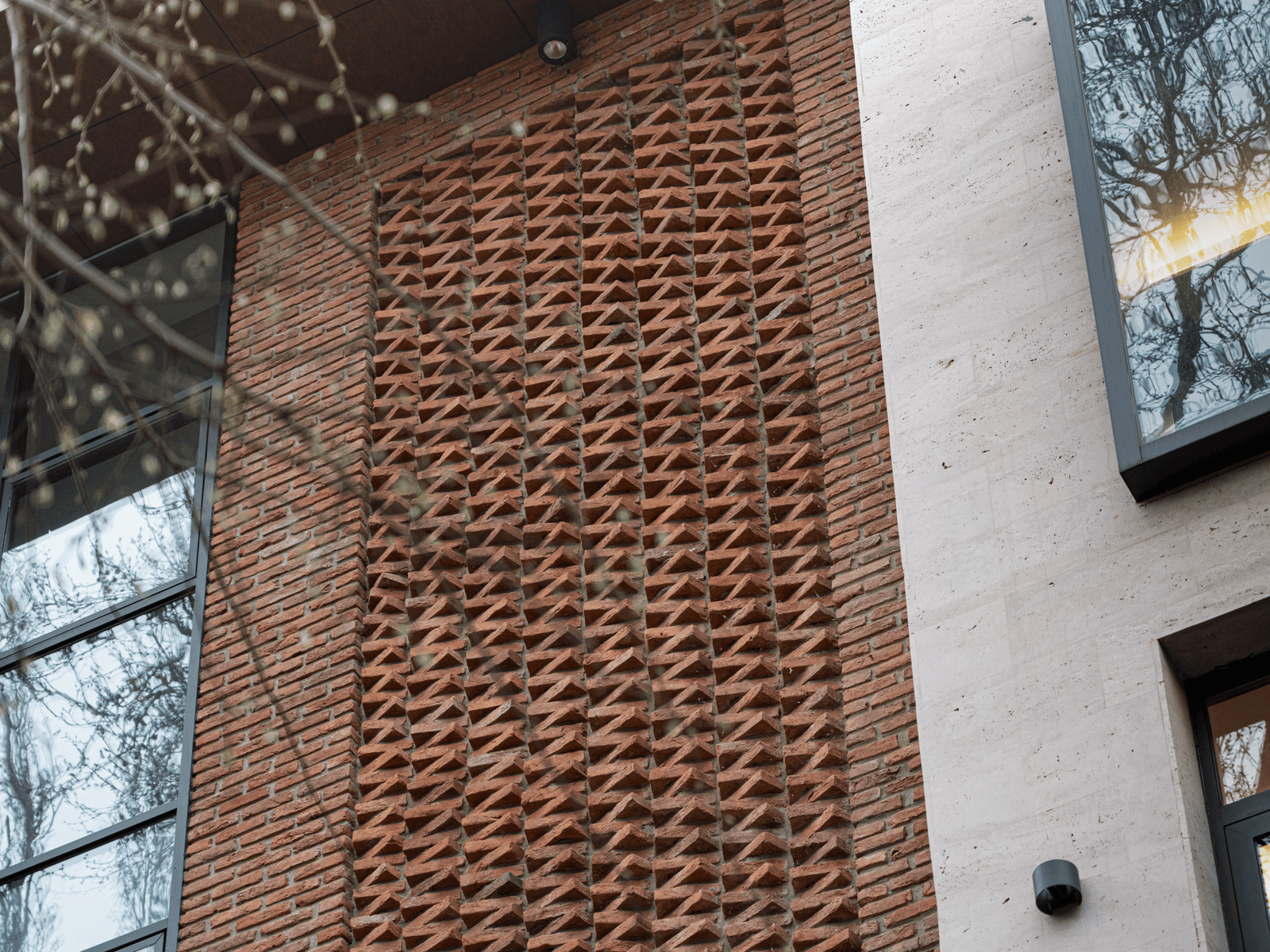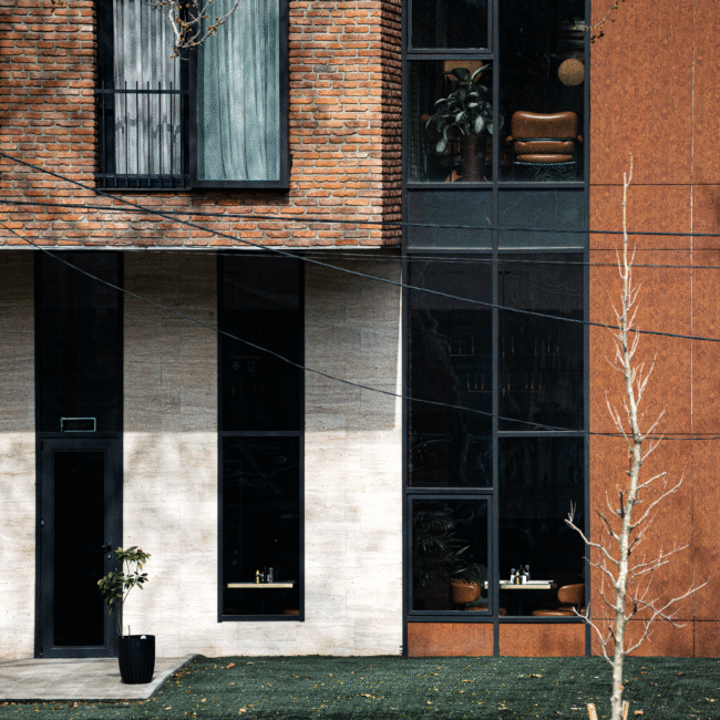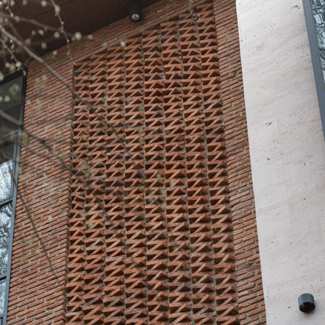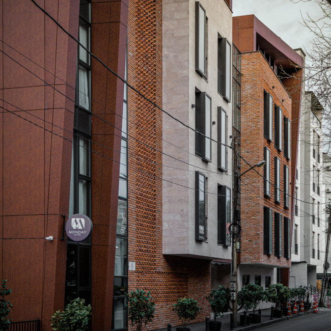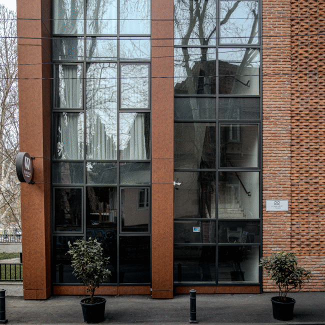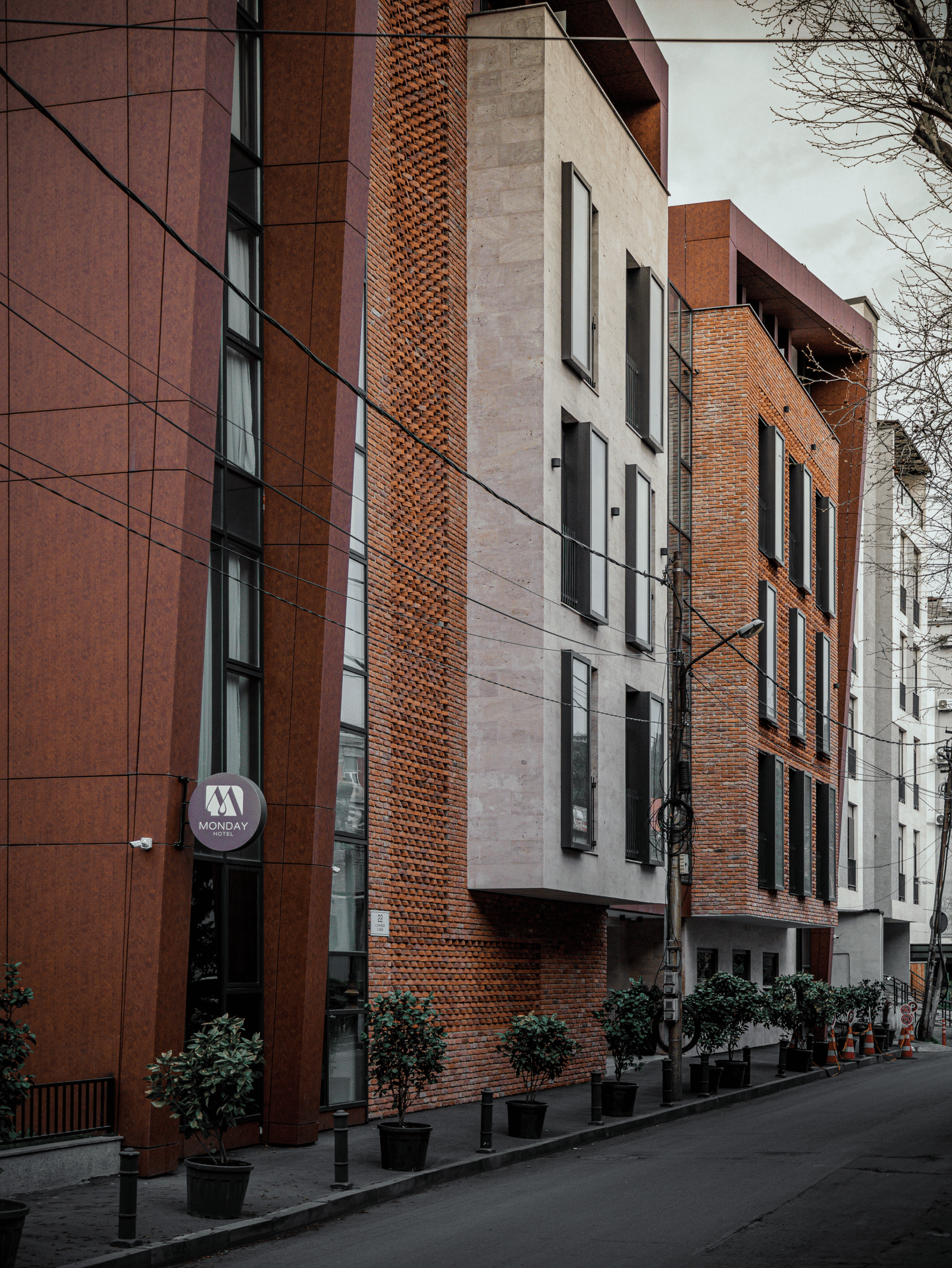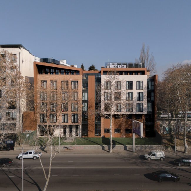 The architectural concept of the hotel building consists of two volumes. One of them features façades treated with decorative brickwork characteristic of Tbilisi’s historic district. The second volume is clad in travertine stone. The two volumes are connected by vertical glass elements. The hotel is completed with a roof covered in copper sheets, and the building’s terminating walls form a kind of relief “skin.”