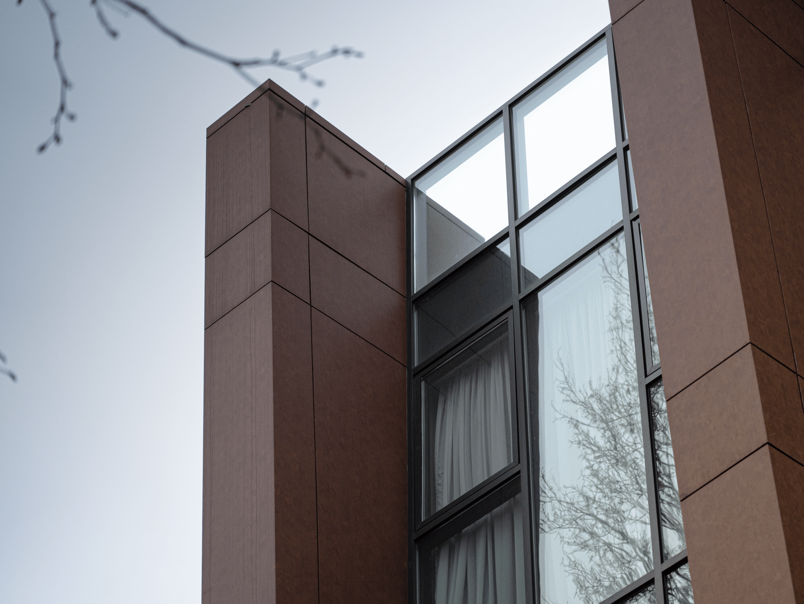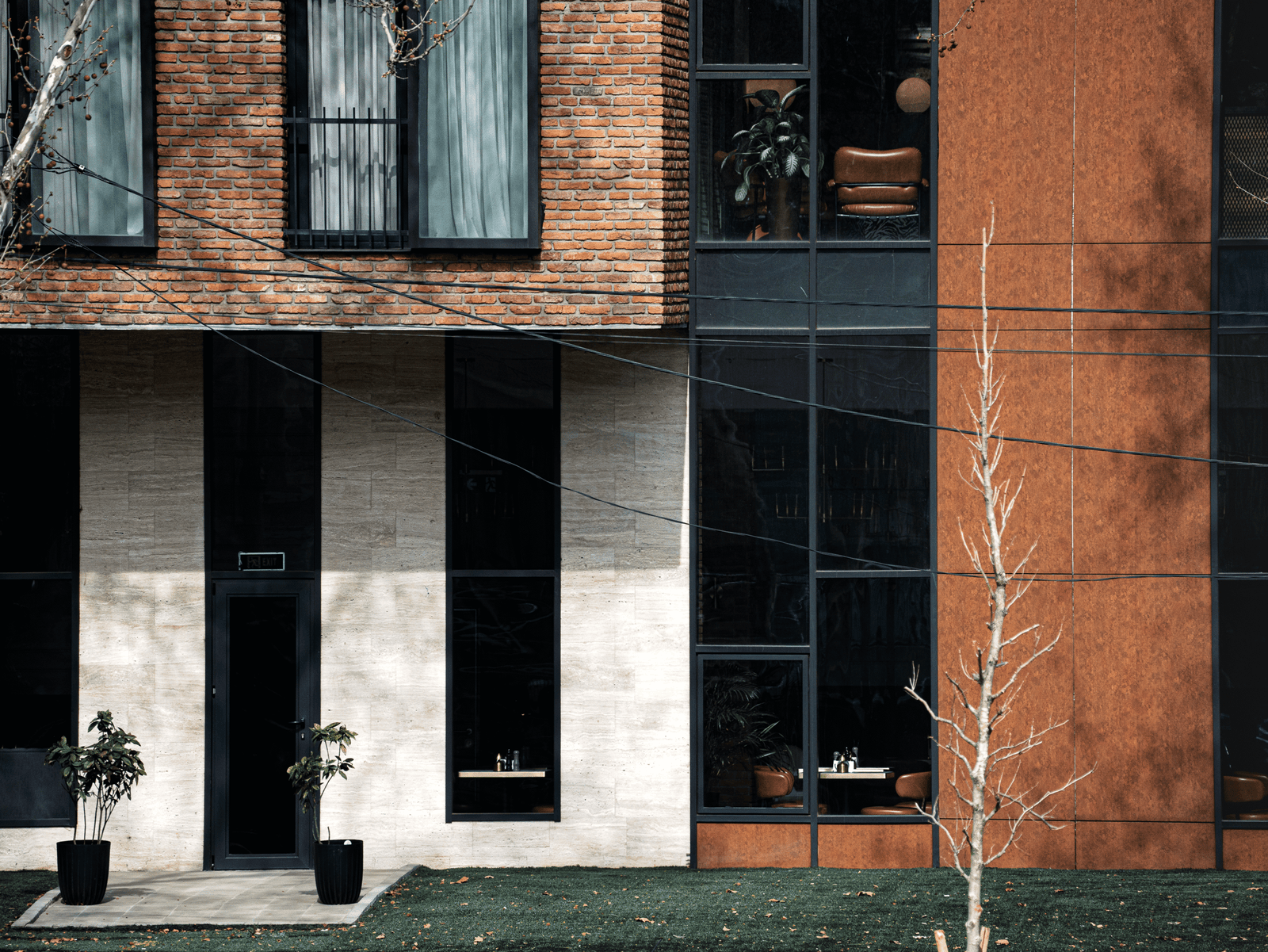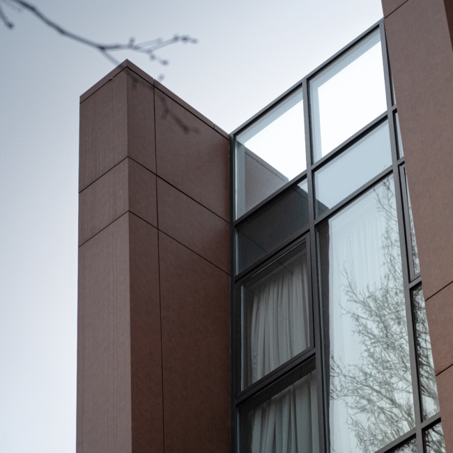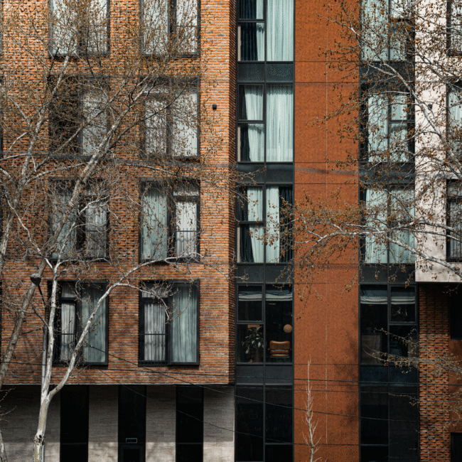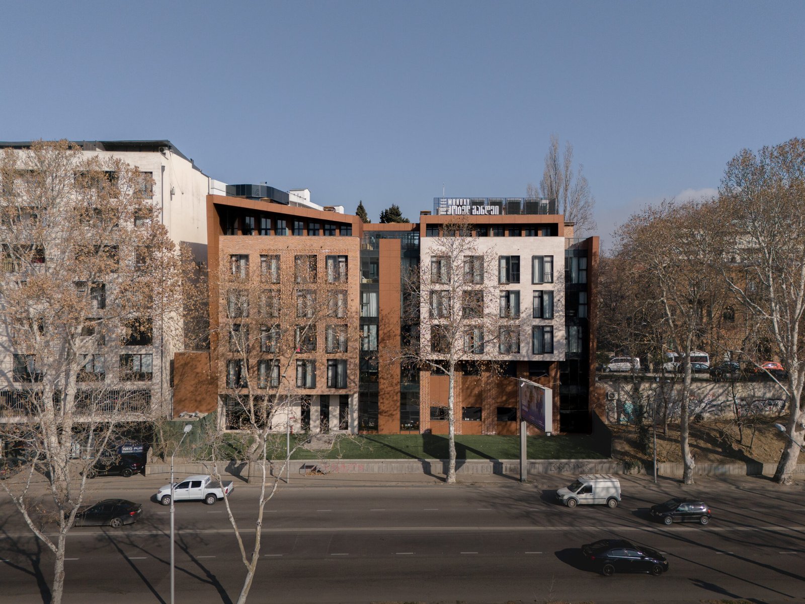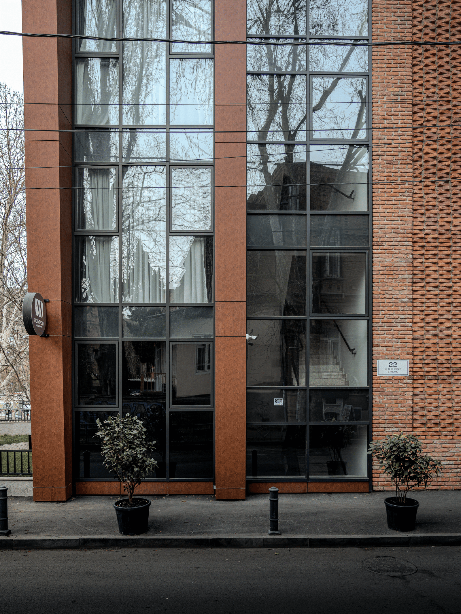 The architectural concept of the hotel building consists of two volumes. One of them features façades treated with decorative brickwork characteristic of Tbilisi’s historic district. The second volume is clad in travertine stone. The two volumes are connected by vertical glass elements. The hotel is completed with a roof covered in copper sheets, and the building’s terminating walls form a kind of relief “skin.”